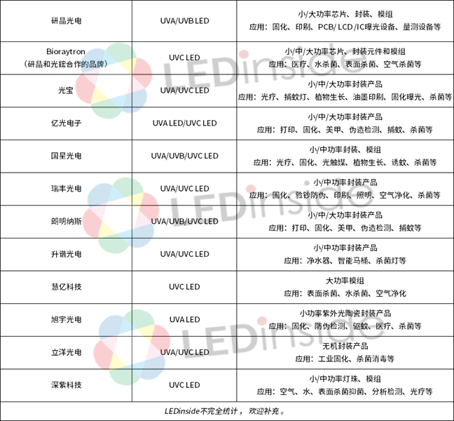另值得注意的是专门研究UV LED领域的企业,如鸿利秉一、钰创合成及Bioraytron。